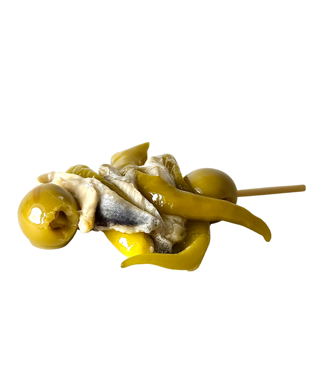 - Elaborada con triple boquerón en vinagre, piparra y aceituna rellena de anchoa.